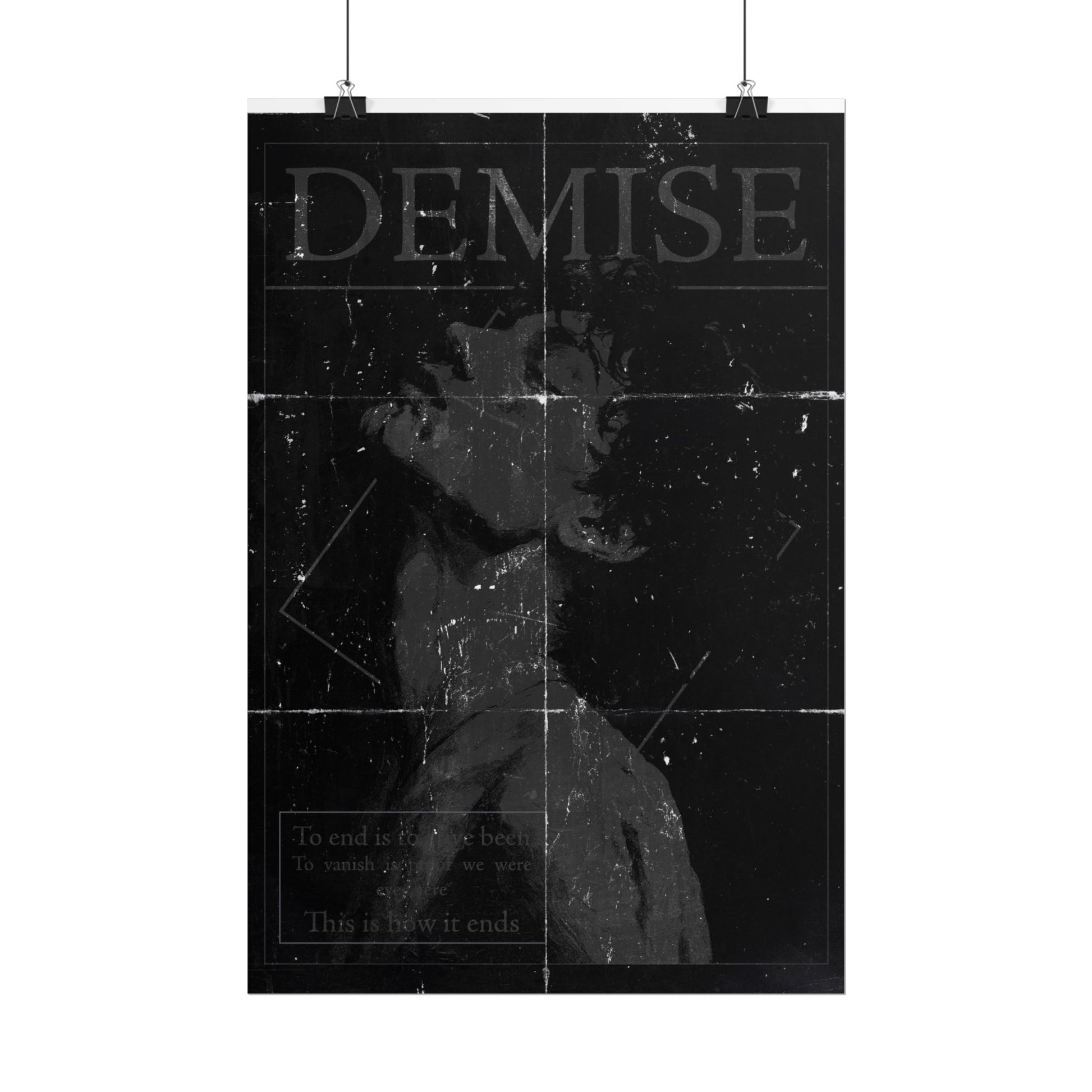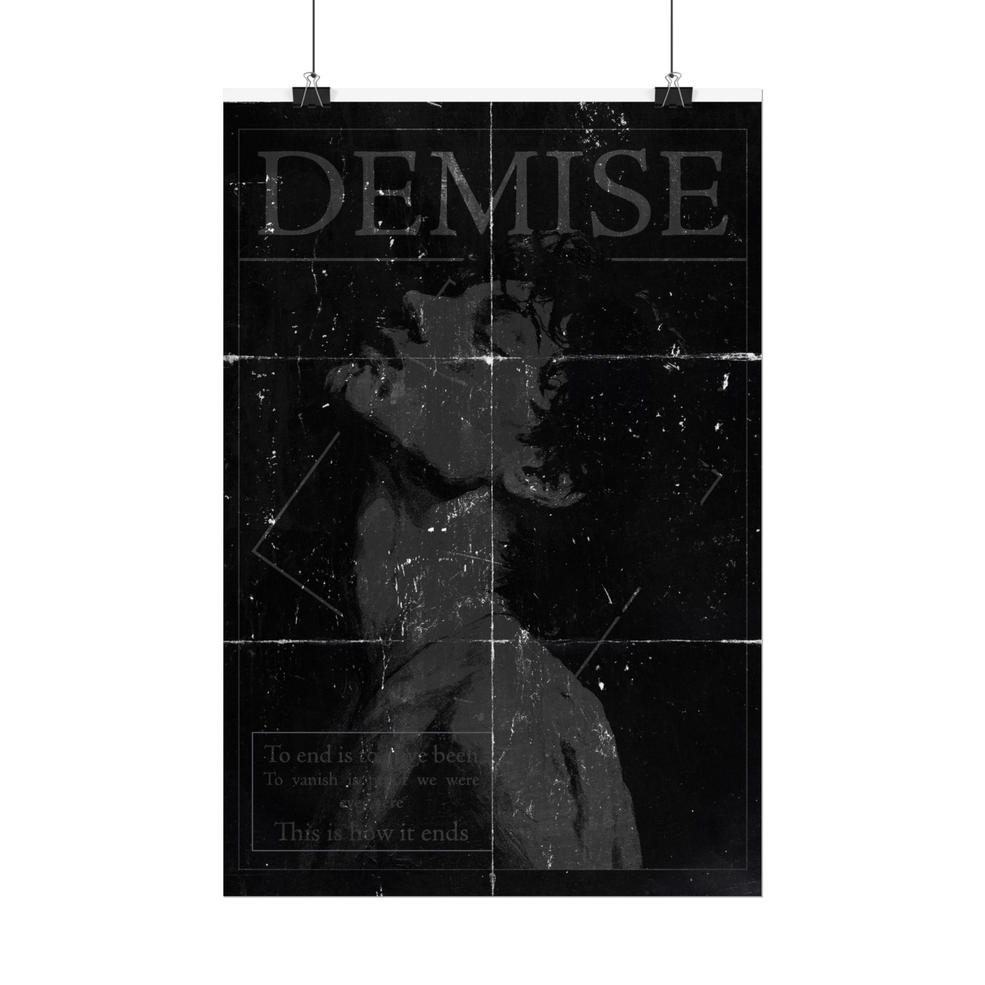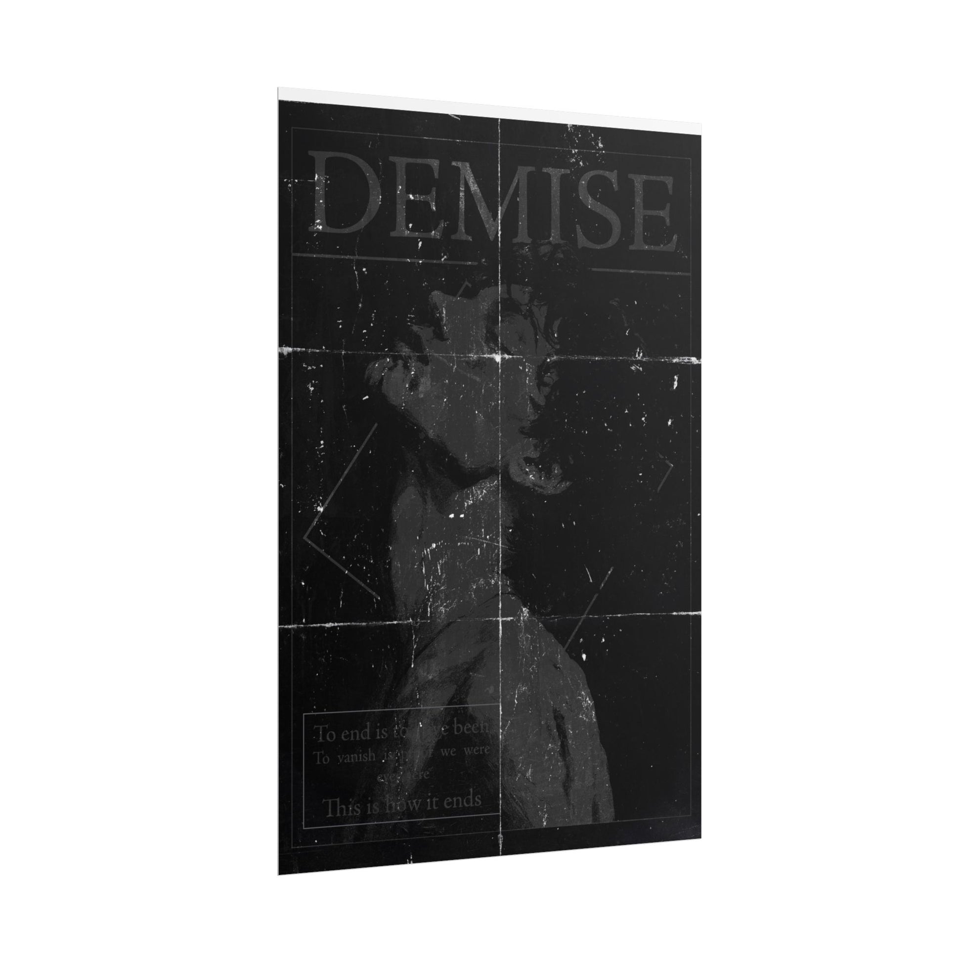 A silent scream. A fading breath. The Demise poster captures the quiet violence of emotional collapse in stark black and white. This piece features a haunting portrait, head tilted back, eyes shut, soul unraveling. Layered with fold marks, scratches, and worn textures that make it feel like something found, not made.