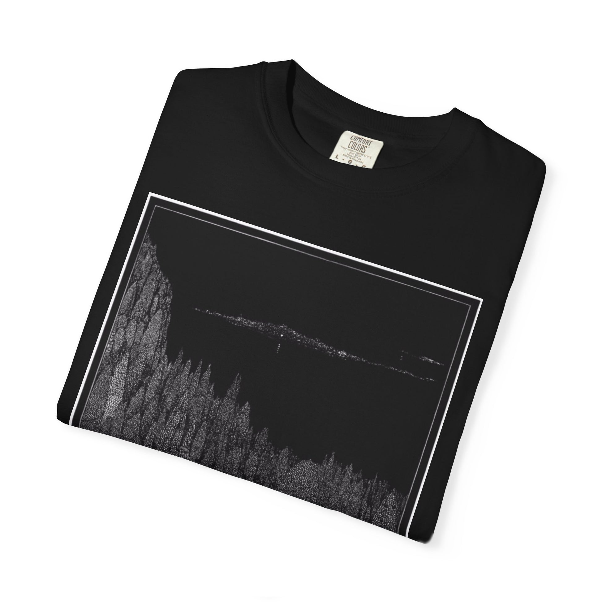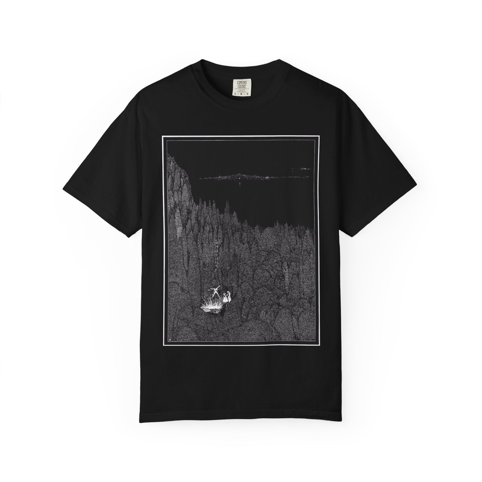 Venture deep into the unknown with the Midnight Descent tee — a haunting black-and-white masterpiece printed on premium garment-dyed cotton. The artwork captures a dreamlike scene: a lone boat floats silently through an ocean of trees, figures illuminated by firelight, dwarfed by an overwhelming forest and abyssal sky. It’s eerie, peaceful, and utterly mesmerizing.
